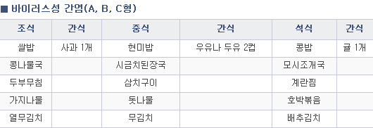 밥, 떡, 감자, 고구마, 과일, 야채, 단백질 식품( 살코기, 생선, 계란, 두부, 콩 등 )