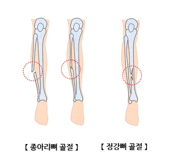 종아리뼈는 교통사고, 운동 중 손상, 추락사고, 스키사고 등으로 골절이 발생할 수 있으며, 정강뼈와 종아리뼈가 함께 골절될 수도 있고, 둘 중 하나만 골절될 수 있습니다. 심한 경우 골절된 부위의 다리 모양이 변형될 수 있습니다.