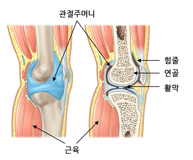 관절을 둘러싸고 있는 구조는 크게 근육, 힘줄, 인대, 활막, 관절주머니, 연골 등으로 나눌 수 있습니다.