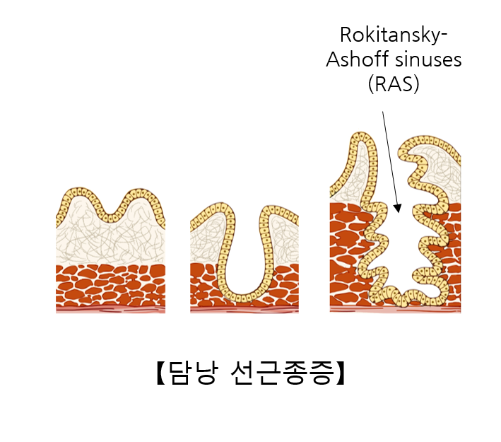 담낭 선근종증의 발생 원인은 명확하지 않습니다. 다만 결석이나 담낭관의 변화, 선천적 막에 의해 담낭이 막히면 이차적으로 담낭 내강의 압력이 증가하여 표피 상피와 근육층의 과잉 증식을 일으킵니다. 담낭 선근종증의 90%에게서 Rokitansky-Ashoff sinuses(RAS)가 관찰됩니다. 과잉 증식된 상피층이 근육층으로 함입되어 낭성 확장과 근육층의 과증식을 일으킵니다.