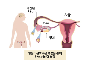 항뮬러관호르몬은 남성 태아발달 관정 중 뮬러관의 퇴화를 촉진시키는 호르몬으로, 여성에서는 과립막세포에서 생성됩니다. 항뮬러관호르몬은 최근 들어 난소 예비력의 지표로 관심이 집중되고 있는데, 나이에 따라 지속적으로 감소하는 양상을 보이고, 기존의 다른 표지자들에 비해 그 변화가 이른 연령에서부터 시작되며, 폐경 이후에는 검출되지 않는다는 특성을 가지고 있습니다.