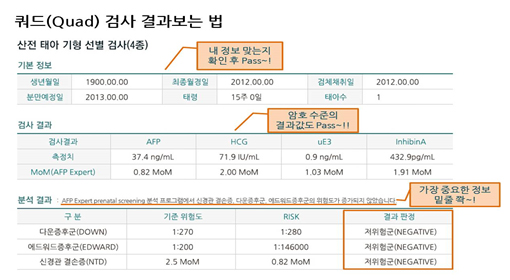 기형아 검사는 측정하는 호르몬의 수치와 산모 나이, 가족력, 몸무게 등 산모의 상태를 종합해서 다운증후군과 에드워드 증후군과 같은 염색체 이상에 대한 위험도를 측정합니다. 그러므로 검사 결과는 '확률이 높다' 혹은 '확률이 낮다'로 나타납니다. 다운증후군은 1:270, 에드워드 증후군 1:200, 신경관결손은 2.5 MoM 이하가 정상입니다.