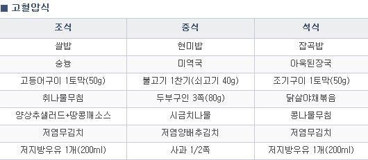 1. 밥은 현미, 보리 등을 섞은 잡곡밥이 좋으며 기호에 따라 적정량 혼식을 합니다. 단, 입맛에 맞지 않을 경우 무리하게 잡곡밥을 고집하지 말고 쌀밥을 섭취하는 것이 좋습니다.