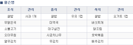 쌀밥, 국수, 쇠고기, 닭고기, 계란흰자, 흰살생선, 우유, 채소류, 과일, 식물성 기름, 설탕 등